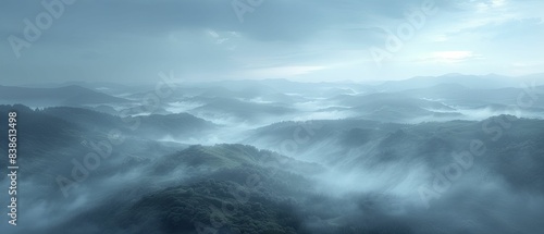 The fog envelops the scenery like a spectral veil, capturing the wide-angle view of the misty countryside at daybreak, serene and enigmatic, with its soothing colors and delicate illumination.