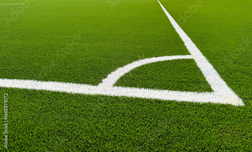 The football field corner with artificial green grass. Line in corner area of soccer field. Photo of a green synthetic grass sports field with white line shot from above. Football grass field corner.