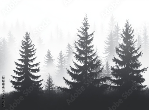The forest features fir trees with three grey colors on a white background
