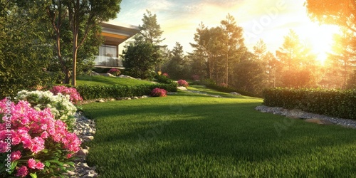 The Garden Lawn at a Modern Home Bathed in Golden Morning Sunlight