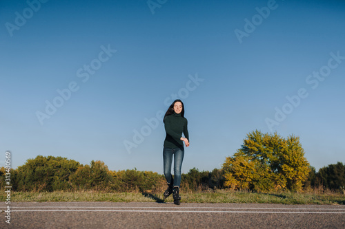 The girl rides on the rollers on the road in the park. Leisure and hobby of active people. Copy space.