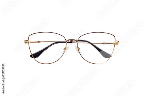The golden female medical eyeglasses with folded temples isolated on a white background