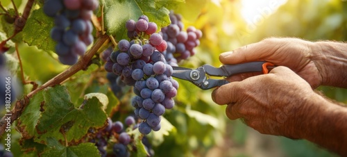 grape, vinery, harvest, vinification, vine-growing, pruning, pruners, hand, fruit, flocked, vine, leaf, sunlight, sunlit, outdoors, farm, farmer, rural, countryside, autumn, ripe, purple, blue, closeup, macro, organic, agricultural, bunch, crop, harvesting, manual, tool, healthy, nature, care, vintage, warm, seasonal, labor, banner