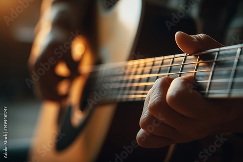 The Guitarist's Touch: Close-up of a guitarist's hands expertly strumming the strings of an acoustic guitar, evoking a sense of musical artistry and passion.