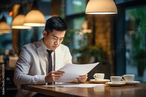 The handsome Chinese man in China is in the coffee shop, looking through the letters in distress