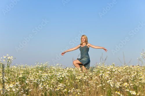 attractive, beautiful, blue, flower, daisy, casual attire, caucasian, chamomile, cute, female, field, fun, girl, green, happiness, happy, lifestyle, love, meadow, outdoors, people, portrait, pretty, jump, relaxation, rest, romantic, sky, smile, summer, woman, young