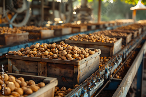 The harvested nuts are meticulously packed in wooden boxes on the sorting line, prepared for distribution at a busy farm during the height of the harvest season