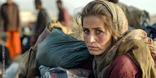 The Human Cost of Conflict: A somber portrait of refugees, their belongings piled in the foreground.