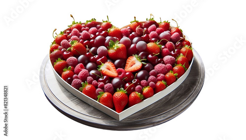 The image depicts a heart-shaped adorned with fresh berries—strawberries, raspberries, and possibly cherries or grapes.