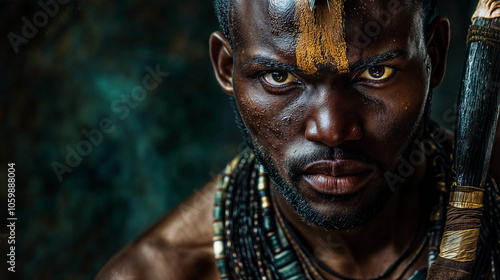 The image depicts a man with a yellow mark on his head, wearing a necklace with beads, and showing a serious expression.