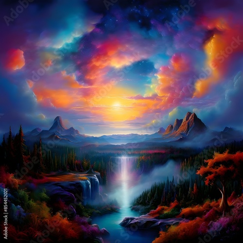 The image depicts a vibrant sunset over a mystical landscape, featuring mountains, a waterfall, and a river. The sky is painted with hues of purple, blue, orange, and yellow, creating an otherworldly.