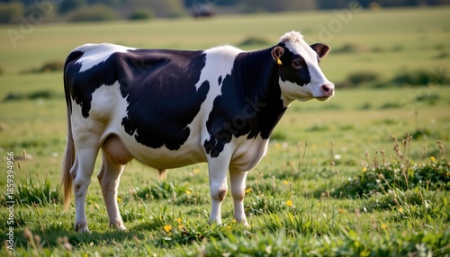 cow, feature, black, white, its, young, standing, lush, green, pasture, scattered, small, yellow, flower, distinctive, coat, patch, covering, part, face, body, background, show, gentle, rolling, hill, clear, sky, ai, generative