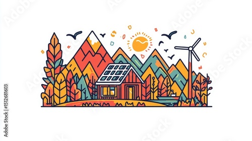 The image features an orange house by the sea, complete with wind turbines and a hot air balloon, and a distant background of snowy mountains, created in a pixel art style