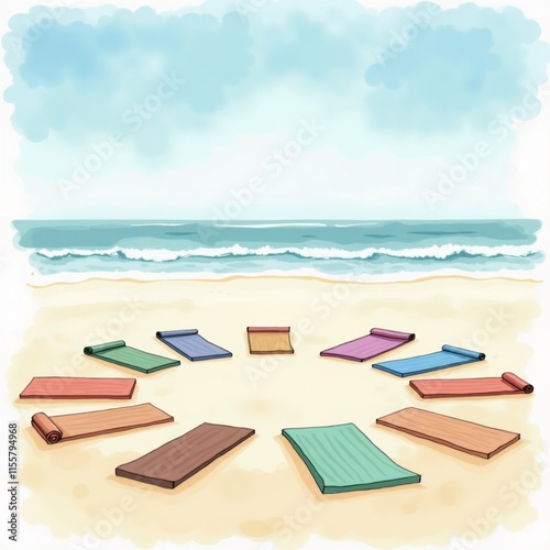 The image is a digital illustration of a beach scene. The background is a light blue sky with white clouds and the ocean in the distance.