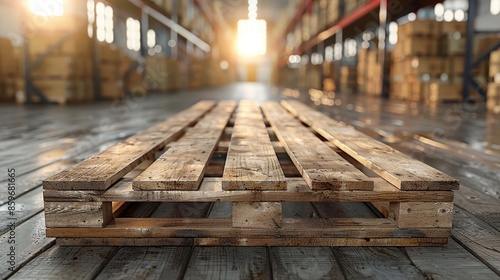 The image portrays a wooden pallet on a brightly lit warehouse floor during sunset, emphasizing the warm glow of the sunlight and the detailed texture of the pallet.
