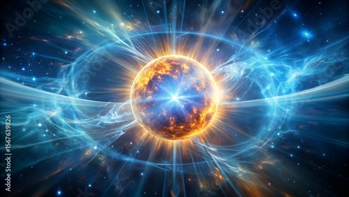 The image showcases a celestial body with a radiant burst of light, surrounded by swirling nebulous patterns, evoking the vastness and energy of outer