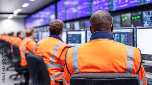 The image shows a group of workers in orange safety vests monitoring data on computer screens in a control room environment.