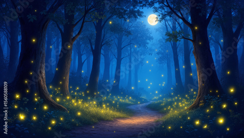 The image shows a path winding through a magical forest at night