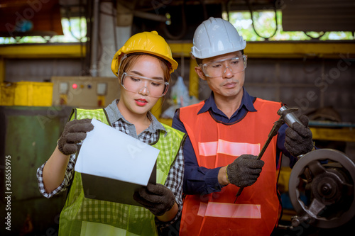 The Industry engineering and worker wearing glass, safety uniform used Vernier caliper to measure the object control operating machine working and worker report in file paper industry factory.