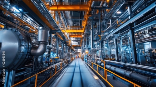 The interior of an industrial plant, with rows of production lines, machinery, and control systems, emphasizing efficiency and organization.