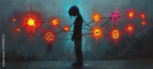chain, symbolic, metaphor, pain, symptom, mental, health, struggle, freedom, restriction, surreal, discomfort, body, perception, persistence, emotional, spontaneous, non, objective, emotional, abstract, expressionism, illustration, panorama, wide, banner, title, landscape, horizontal, hero, background, desktop, wallpaper