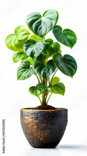 The leaves of a leafy philodendron in a rustic pot are shaped like hearts.