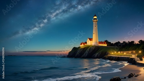 the lighting of a lighthouse that illuminates the evening sea