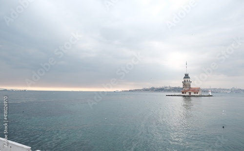 The Maiden's Tower under gray cloudy sky, Bosphorus, Istanbul, Turkey during overcast weather with sunshine reflection in bosporus sea. Groups of seagulls flying on sea. İstanbul Turkey 01.03.2021