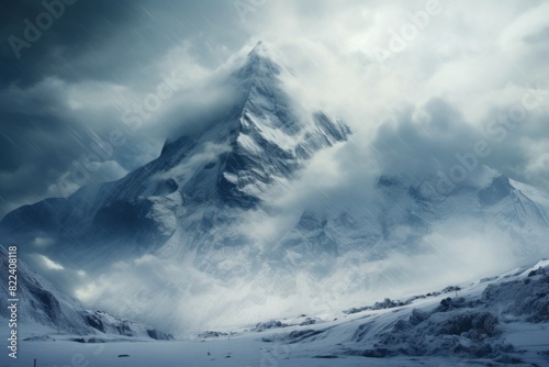 The majestic snow-covered mountain peak in winter. Creating a serene and tranquil landscape with dramatic mist and cold ice at high altitude