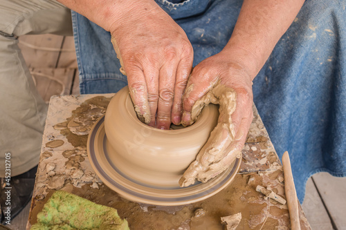 The master potter works in the workshop. The hands of a potter are neatly and confidently shaped by a clay pot on a potter's wheel. Clay product on a potter's wheel.