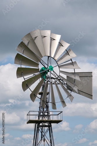The metal blades of an american wind engine against a cloudy and stormy sky.