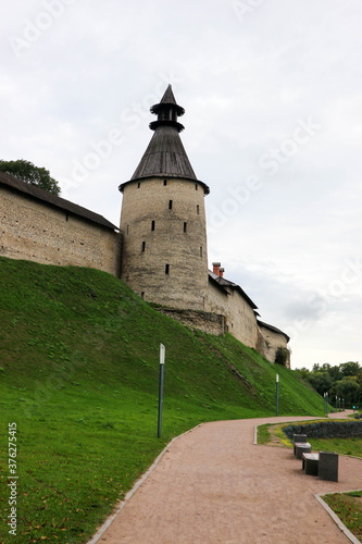 The middle tower with wooden roof of Pskov kremlin (krom) medieval fortress, famous landmark of Russia