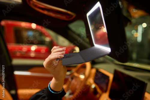mirror, vanity, automotive, vehicle, interior, car, cosmetic, modern, dashboard, glamour, luxury, cosmetic, lighting, futuristic, accessory, closeup, elegance, appearance, urban, sleek, technology, fashion, exquisite, ambience, photo, plush, contrast, convenience, display, travel, design, safety, artistry, material, finishing, ambience, detail, lifestyle, hand, innovation, comfort, utility, refined, style, user, professional, functional