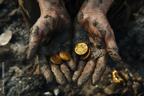 The muddy and dirty hands of a gold digger found a gold bar in a gold mine.