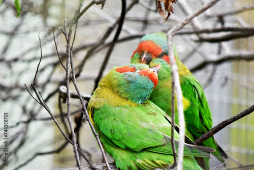 The musk lorikeet is mainly green and it is identified by its red forehead, blue crown and a distinctive yellow band on its wing.