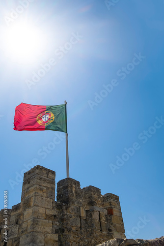 the national flag of portugal flies on top of a battlement of the castle of St. George in Lisbon on a sunny day, blue sky