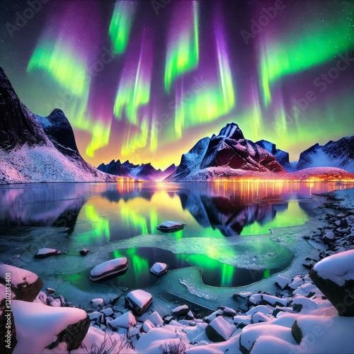 aurora, borealis, mountain, snow, glacé, lake, scenic, vibrant, glow, natural, beauty, wilderness, night, adventure, light, untouched, outdoors, serene, harmony, sky, nature, aethereal, atmospheric, photo, travel, inspiration, pristine, eco, majestic, discovery, colours, landscape, breathtaking