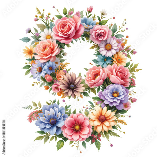 The number "9", created from pink, yellow and white flowers framed by green leaves. The bright composition on a white background symbolizes joy and freshness.