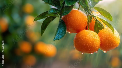 The oranges glisten with raindrops on a sunny garden backdrop.
