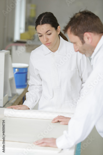 instructor, profession, woman, client, paint, young, training, 2, male, man, teacher, adult, man, showing, trainee, apprentice, sample, improvement, vocation, person, working, craftsman, colours, craftsmanship, painter, decoration, wall, trainer, house, on, renovation, job, white, brush, old, experienced, apprenticeship, occupation