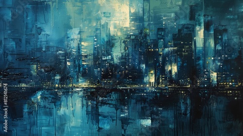 The painting is of a cityscape at night. The city is depicted in shades of blue and purple. The lights of the city are reflected in the water. The painting has a dreamlike quality.