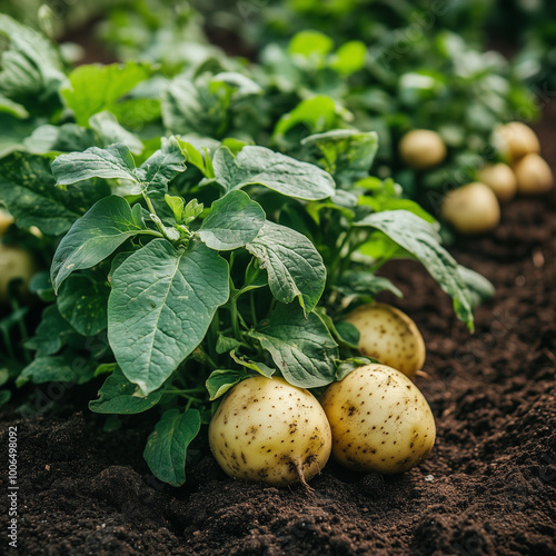 The photo capturing fruit-bearing plants and vegetable garden thriving in dark soil. Each plant is depicted with its full fruits