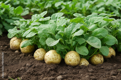 The photo capturing fruit-bearing plants and vegetable garden thriving in dark soil. Each plant is depicted with its full fruits