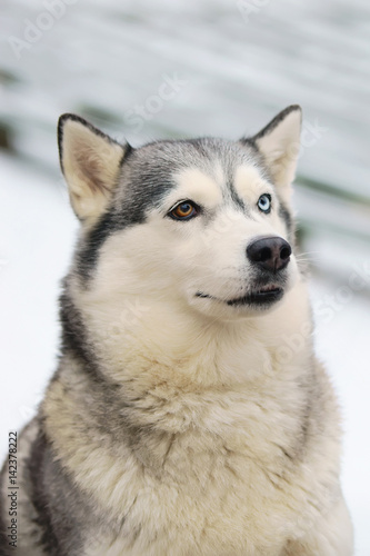 The portrait of a grey Siberian Husky dog with different eyes sitting outdoors in winter