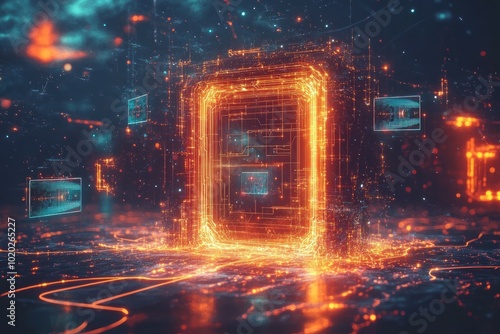 quantum, computing, gateway, portal, swirling, particle, glowing, line, holographic, circuit, new, digital, technology, computation, state, transition, node, expressive, ambiguous, experimental, abstraction, abstract, art, illustration, print, landscape, background, desktop, wallpaper
