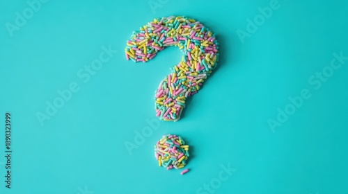 question mark, sprinkle, candy, colourful, turquoise, pastel, dessert, punctuation, symbol, creative, blue, sweet, composition, background, concept, playful, texture, confectionery, decoration, vibrant, minimal, studio, overhead, snack, celebration, sweetened, icing, rainbow, party, curiosity, icon, shape, design, closeup, isolated, visual, sprinkle, food, quirky, style
