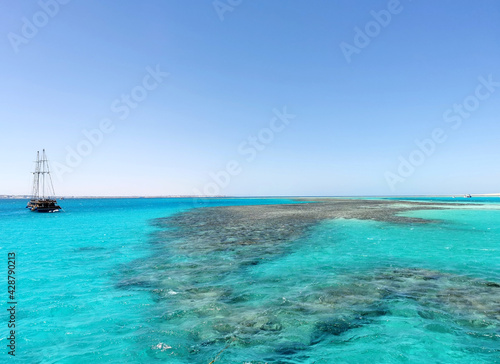 The Red Sea reefs seascape with ship silhouette on the horizon. Travel and recreation in Egypt, sea excursion above the reef for snorkeling and beautiful nature