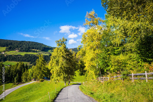 dolomite, alps, road, tree, green, autumn, italy, travel, vale, sun, tyrol, concept, tour tourism, ecological, active, meadow, forest, outdoors, blue, mountain, nature, europa, mountain, grass, colours, scenic