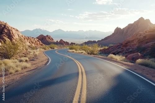 The road in the valley of red rocks, a desert landscape with rocky mountains in the background. Concept for travel and adventure.