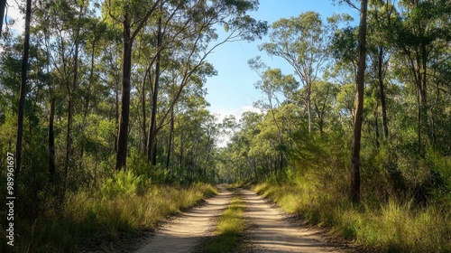 The sandy off-road bush track leads deep into the forest, framed by tall trees and the open sky, ideal for wilderness scenes
